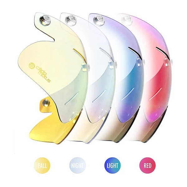 – Existen cuatro colores: SkyNight (Visor Transparente), SkyFall (Visor Amarillo) con tecnologÃa Blue Revo® que incrementa el contraste y reduce el brillo. Especialmente indicado para terrenos con mucha iluminación o neblinosos, SkyLight (Visor Ahumado) para un menor contraste y protección frente a destellos y el SkyRed (Visor Rojo) con lente de tinte rojo oscuro para un mayor contraste y protección ocular con luz brillante