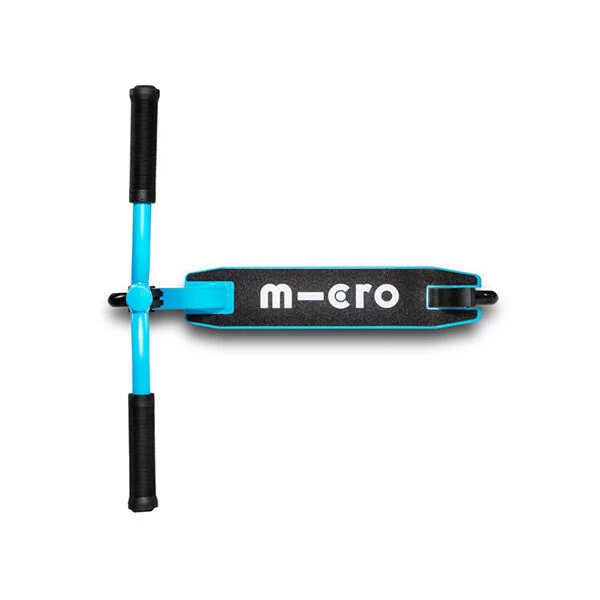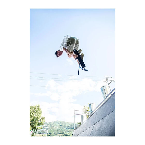 Este scooter tiene un manillar extra-ancho que gira 360º y ruedas pequeñas para que sea mas maniobrable. Con un peso de 3.7Kg, este scooter es muy ligero y muy robusto, ya que fue diseñado para resistir los golpes relacionados con los trucos hechos en los skate-parks.