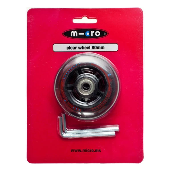 Pack de rueda transparente de poliuretano de 80mm, rodamientos, separador y llave para sustituir a la rueda trasera de los patinetes Micro Mini y Micro Maxi.
