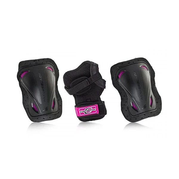 Pack de protecciones de Rollerblade Bladegear en negro / rosa compuesto por rodilleras, coderas y muñequeras.